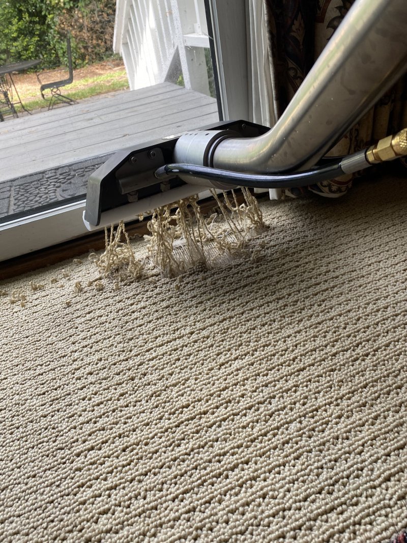 What the heck happened there? It doesn't look sun damaged enough to cause that and I've cleaned a boatload of that particular style and fiber with no issues . I had that happen once but not that extreme. It was sun damaged 18 year old olefin.
