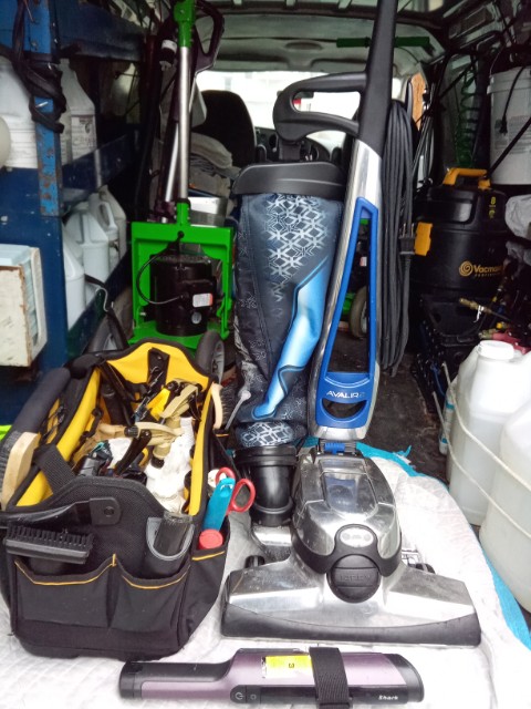 Call me old-fashioned. The best vacuum to me is, as I call it, a selective dumpster find. I'm sure many of you old-timers have done that. Mrs. Jones buys a $200 vacuum and uses it for two months; the intake port gets clogged, the roller gets messed up from a bunch of hairs, and Mrs. Jones gets frustrated and buys a new one. Old- new unfaithful vac is facing the dumpster. I got two Sharks, two Bissels, one Hoover, and one I didn't identify yet. It's so rewarding